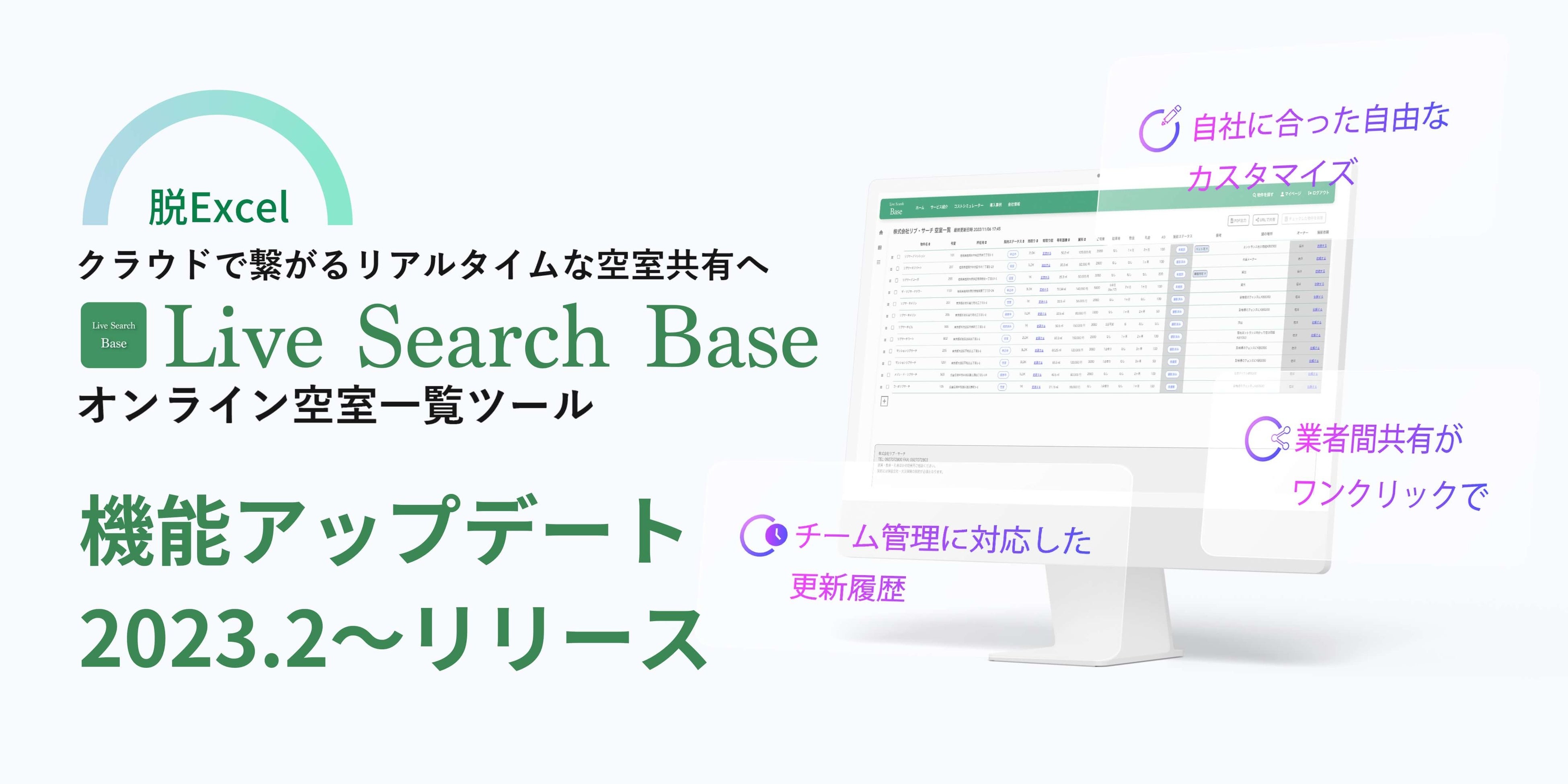 『Base』は、Live Searchが新たに開発した、オンラインで空室一覧管理ができるツールです。これまで多くの会社様がExcel等で管理していた空室一覧表を『脱Excel化』し、『クラウド管理』できるようになります。これにより、『いつでも』『どのデバイスからでも』タイムリーな情報の確認・共有が可能になります。Excel並みの自由度はそのままに、オンラインならではの機能が盛り沢山。簡単な登録作業で利用が開始でき、利用料は一切かかりません。