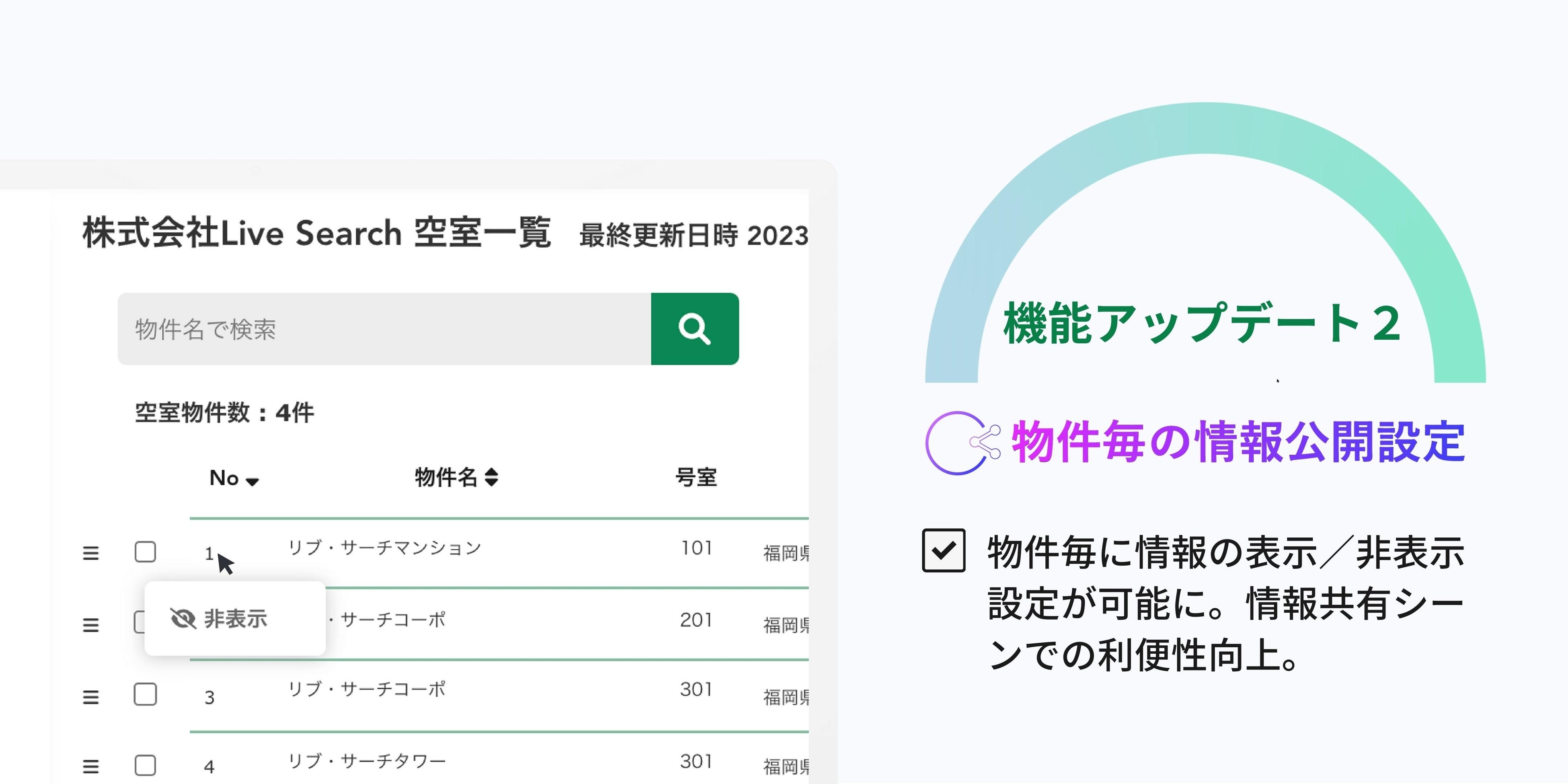 これまでは各項目の表示/非表示の設定が可能でしたが、物件毎による設定も可能になりました。今後は、任意の物件および項目を非表示にすることができ、業者間等における空室の情報拡散シーンにおいて利便性が向上します。
