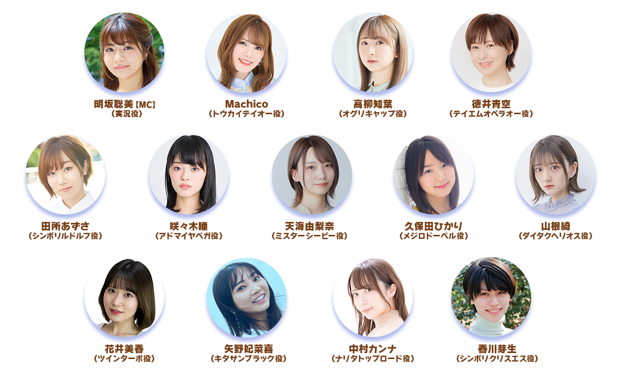 【MC】明坂聡美(実況役)、Machico(トウカイテイオー役)、高柳知葉(オグリキャップ役)、徳井青空(テイエムオペラオー役)、田所あずさ(シンボリルドルフ役)、咲々木瞳(アドマイヤベガ役)、天海由梨奈(ミスターシービー役)、久保田ひかり(メジロドーベル役)、山根綺(ダイタクヘリオス役)、花井美春(ツインターボ役)、矢野妃菜喜(キタサンブラック役)、中村カンナ(ナリタトップロード役)、春川芽生(シンボリクリスエス役)