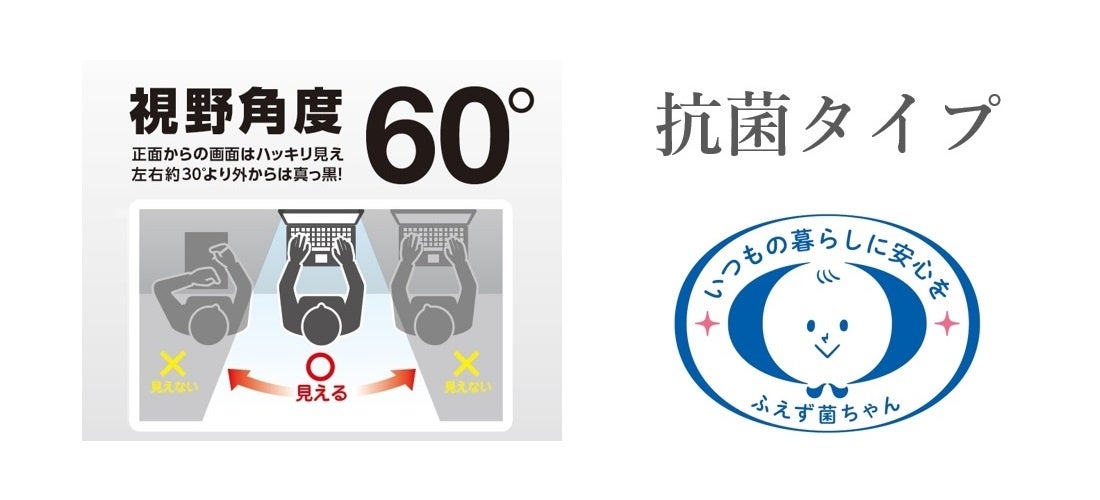 オフィスでの周りからの視線をしっかりガード!抗菌タイプののぞき見防止フィルターです。新たに22インチから27インチまで6サイズをラインアップしました。画面の正面を中心に60度(左右30度)より外の角度からは真っ黒に見えるので、画面を見られる心配がありません。