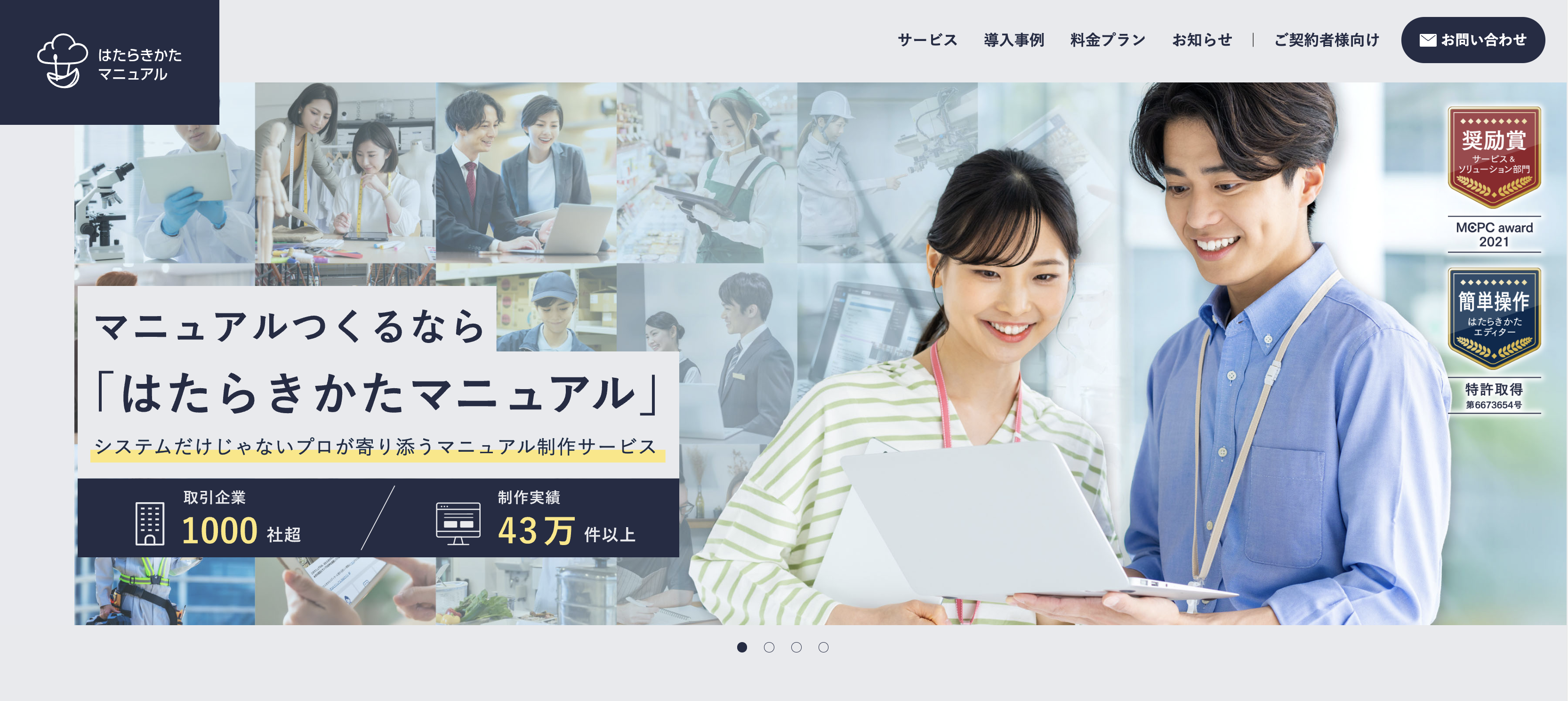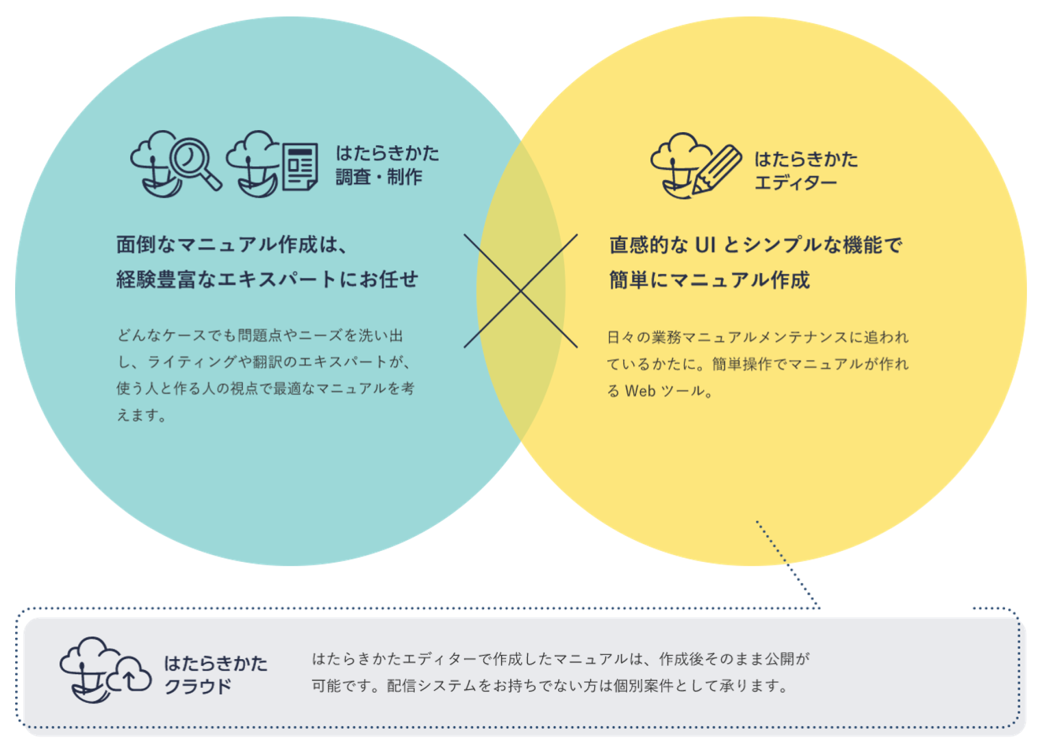「はたらきかたマニュアル」は業務マニュアルの総合サービスとして、「はたらきかた調査・制作」「はたらきかたエディター」「はたらきかたクラウド」を提供しております。調査・制作から、Webツールを利用したペーパーレス化・DX化を包括的に対応いたします。