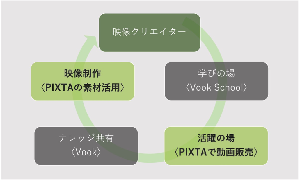 そこで、双方の「クリエイター支援」という想いが合致。独学では難しい体系だったカリキュラムが強みの『Vook School』を映像制作の学びの場として提供するとともに、学びを経て制作した動画素材を「PIXTA」で販売、さらに『Vook』でPIXTAの動画素材の活用法等を紹介し、活用を促していく好循環を生み出すことで、両社のクリエイターに学びと活躍の機会を提供できると考えました。