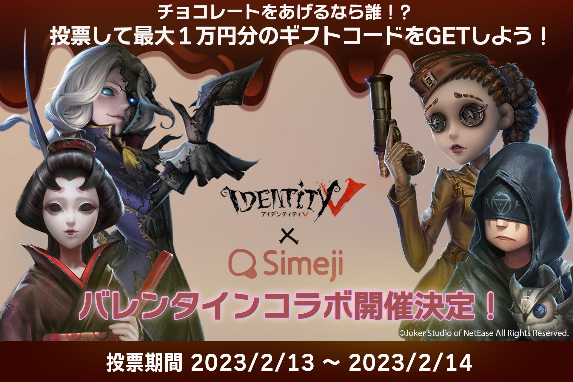 2.公式アカウントから投稿される「Identity V 第五人格×Simejiバレンタインキャンペーン」告知ツイートより、チョコレートを渡したいキャラクターに投票&RT。(応募完了)