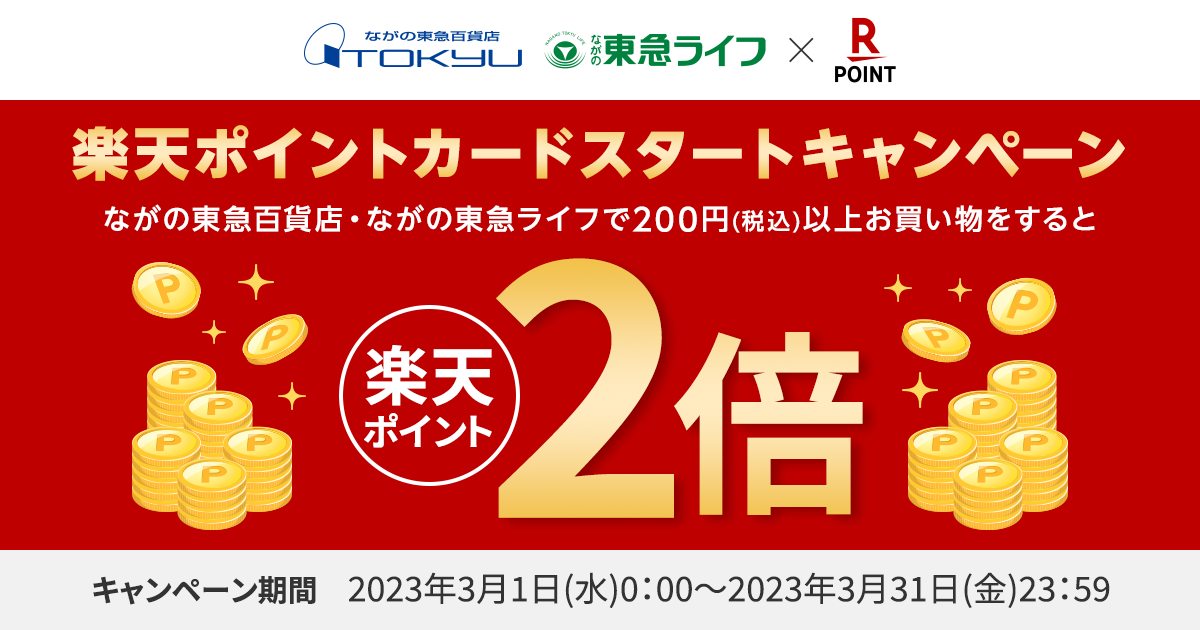 | キャンペーン名称 | 「ながの東急百貨店・ながの東急ライフ 楽天ポイント2倍キャンペーン」 |