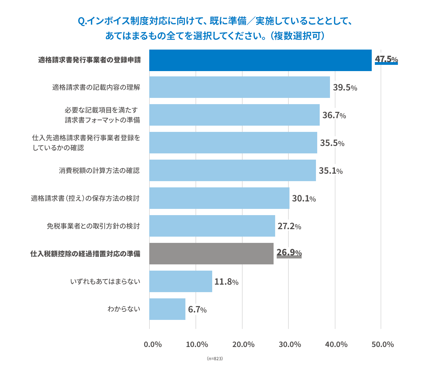 インボイス制度対応に向けて既に準備/実施していることを伺ったところ、最も進んでいるのは47.5%の企業が回答した「適格請求書発行事業者の登録申請」となりました。