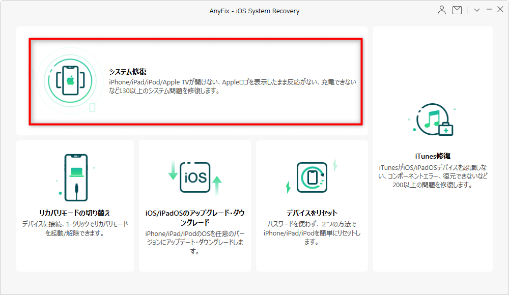 Step 1: パソコンにAnyFixをインストールして起動します。iPhone/iPadをUSBケーブルでパソコンと繋ぎ、「システム修復」機能を選択します。