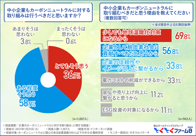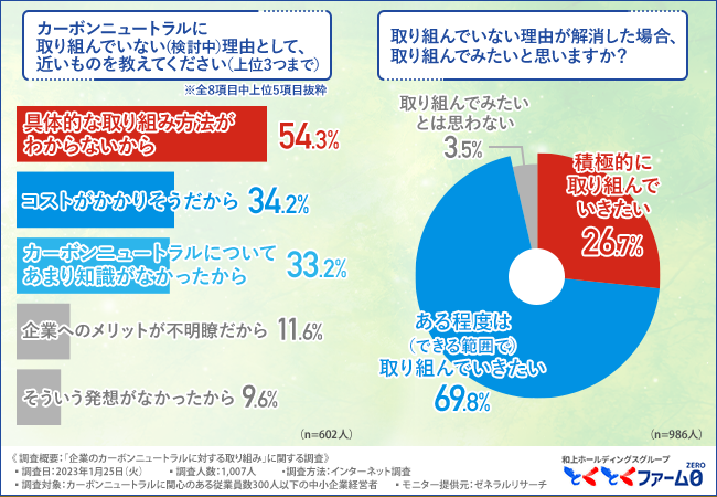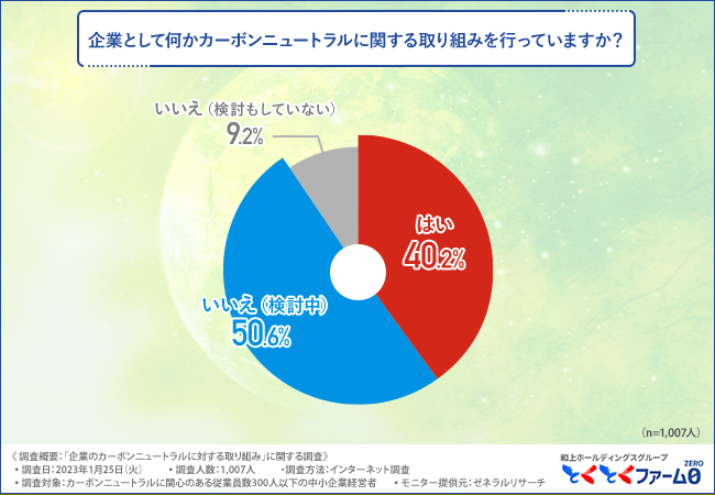 そこで今回、企業の脱炭素経営を総合サポート『とくとくファーム0』(https://wajo-holdings.jp/farmzero/)を運営する株式会社和上ホールディングスは、カーボンニュートラルに関心のある従業員数300人以下の中小企業経営者を対象に、「企業のカーボンニュートラルに対する取り組み」に関する調査を実施しました。
