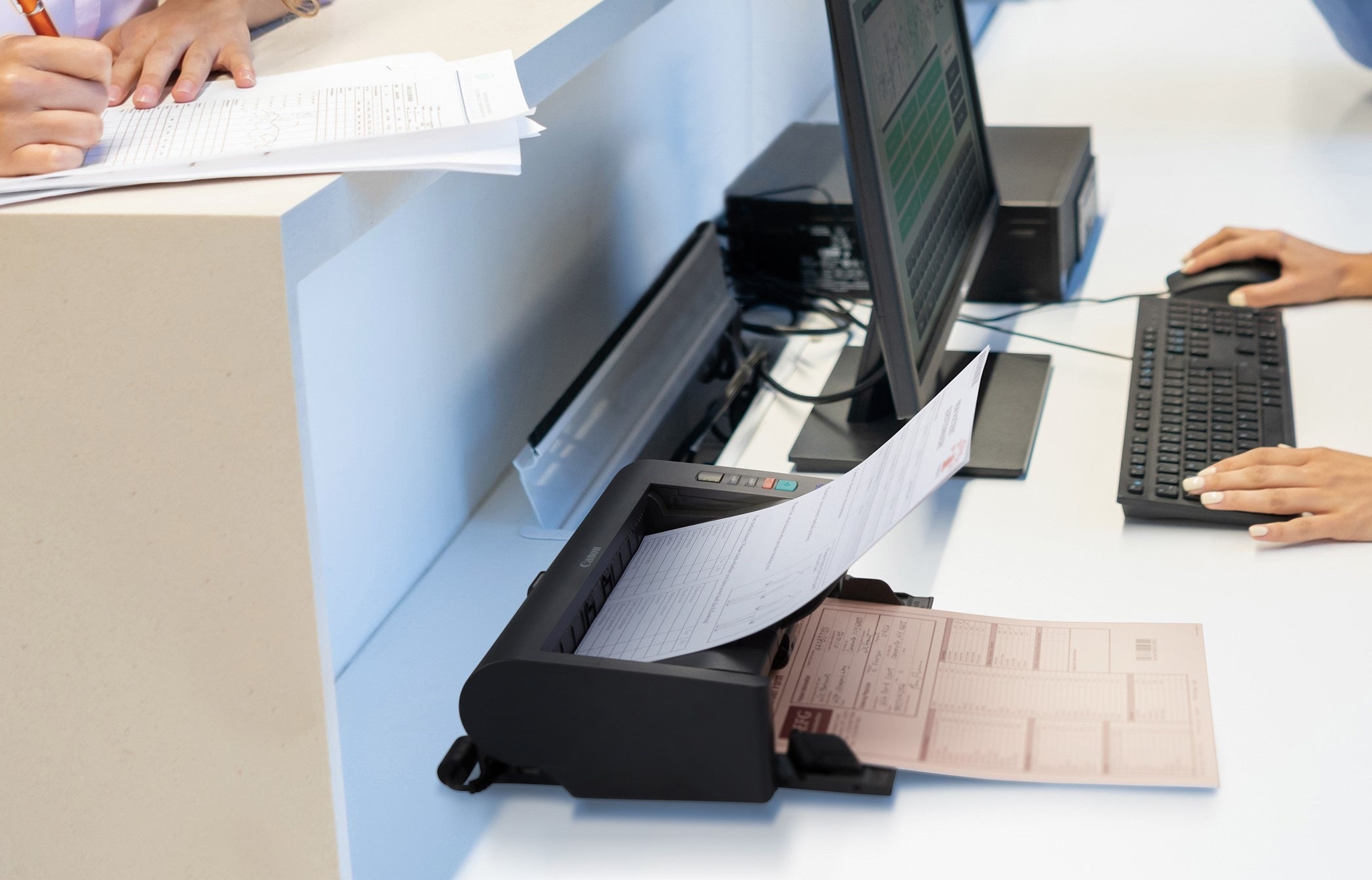 このたびキヤノンMJが発売する “imageFORMULA DR-M1060II/DR-M140II”は、窓口業務などの限られたスペースに設置が可能で、高速かつ効率的な読み込みを実現するドキュメントスキャナーです。コンパクトな設計に加え、本体前面から給紙されたスキャン原稿が上部のトレイに排出される「Uターンパス」を採用しています。さらに給紙ローラーの交換やメンテナンスも本体前面で完結するため、デスクやカウンターでの窓口業務などにおける限られたスペースでの利用に適しています。また、普通紙から名刺まで多様な用紙や免許証などのカードをスキャンすることができ、窓口業務の効率化を支援します。