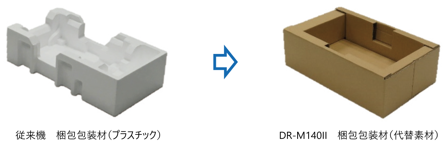 資源や環境に対する社会的な課題解決に取り組むため、imageFORMULAシリーズでは環境負荷の低い素材の採用を積極的に進めています。“DR-M1060II” は本体に使用している再生樹脂の使用率を従来機種※の11%から20%以上へ、“DR-M140II”は1%から20%以上へ向上させています。また、従来の梱包に使用していたプラスチックを環境に配慮した代替素材に置き換えることで環境負荷低減を図っています。