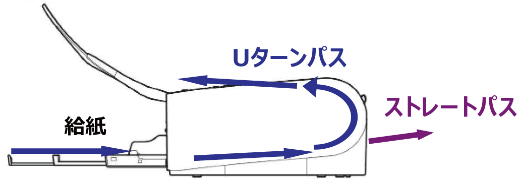 「Uターンパス」により、本体前面だけで普通紙や帳票などの給排紙が可能です。「ストレートパス」は、免許証やカードなど厚みのある原稿を本体背面から排出することで確実な搬送を実現します。2つの搬送方式を切り替えることで多彩な原稿に柔軟に対応し、業務の効率化をサポートします。
