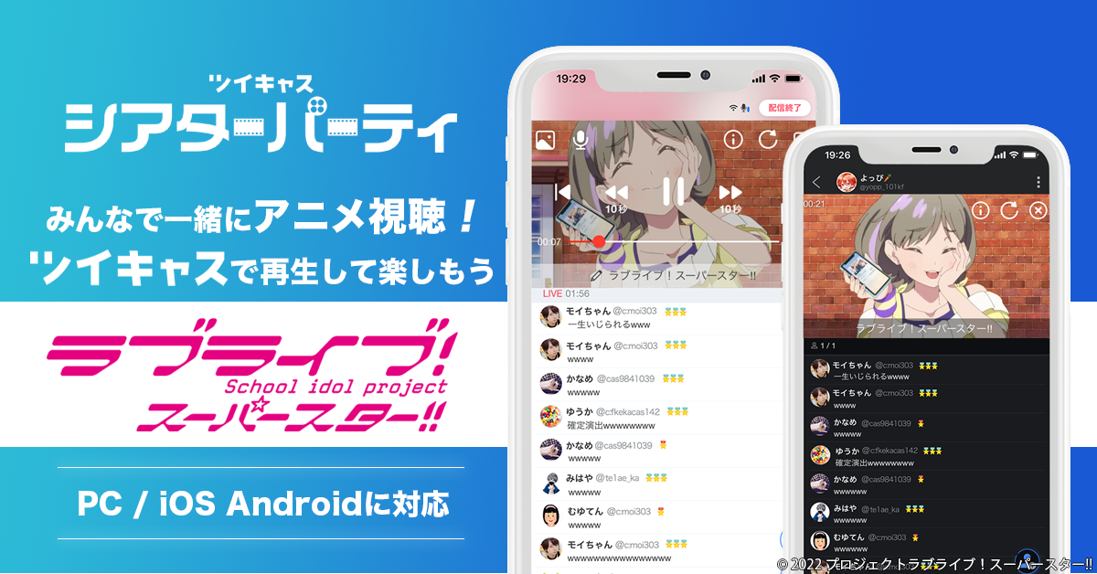 ツイキャス配信中に、シアターパーティでコンテンツを選択すると、リスナーと一緒にアニメ映像をお楽しみいただけます。さらに、ラブライブ!シリーズ公式チャンネルがシアターパーティの公式動画に登場中!