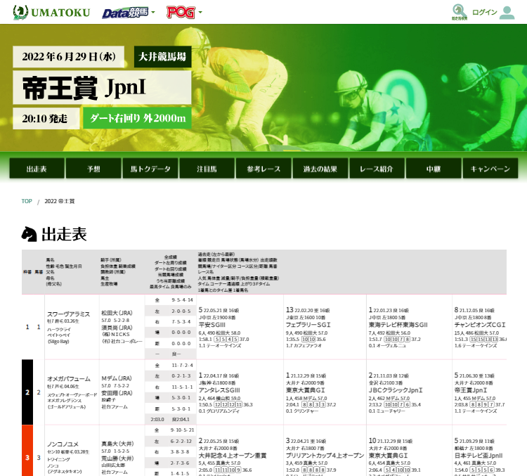 報知新聞社が運営する競馬専門サイト「馬トク」では6月29日に大井競馬場で開催されるダートの上半期総決算レース「第45回帝王賞」の特設ページを開設しています。馬トク独自のデータでレースを分析。また、BS11競馬中継の解説でもおなじみ、スポーツ報知大上賢一郎記者、馬トクによるオリジナリティあふれる予想も展開しています。
