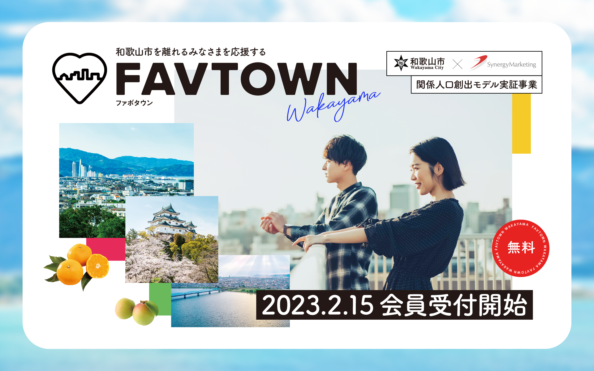 シナジーマーケティング株式会社(所在地:大阪市北区、代表:田代 正雄、以下当社)は、2022年10月17日に和歌山市(市長:尾花 正啓)と「関係人口創出モデル実証事業」に関する連携協定を締結。これに基づいた施策として、主に進学や就職などで和歌山市を離れる若者とそのふるさと和歌山市をデジタルの力でつなぐコミュニケーションサービス「FAVTOWN wakayama」が本日2023年2月15日にオープンしたことをお知らせします。なお、当社では本実証事業を、昨年10月に開始した地域創生事業「re:connect」の一環として位置付けています。