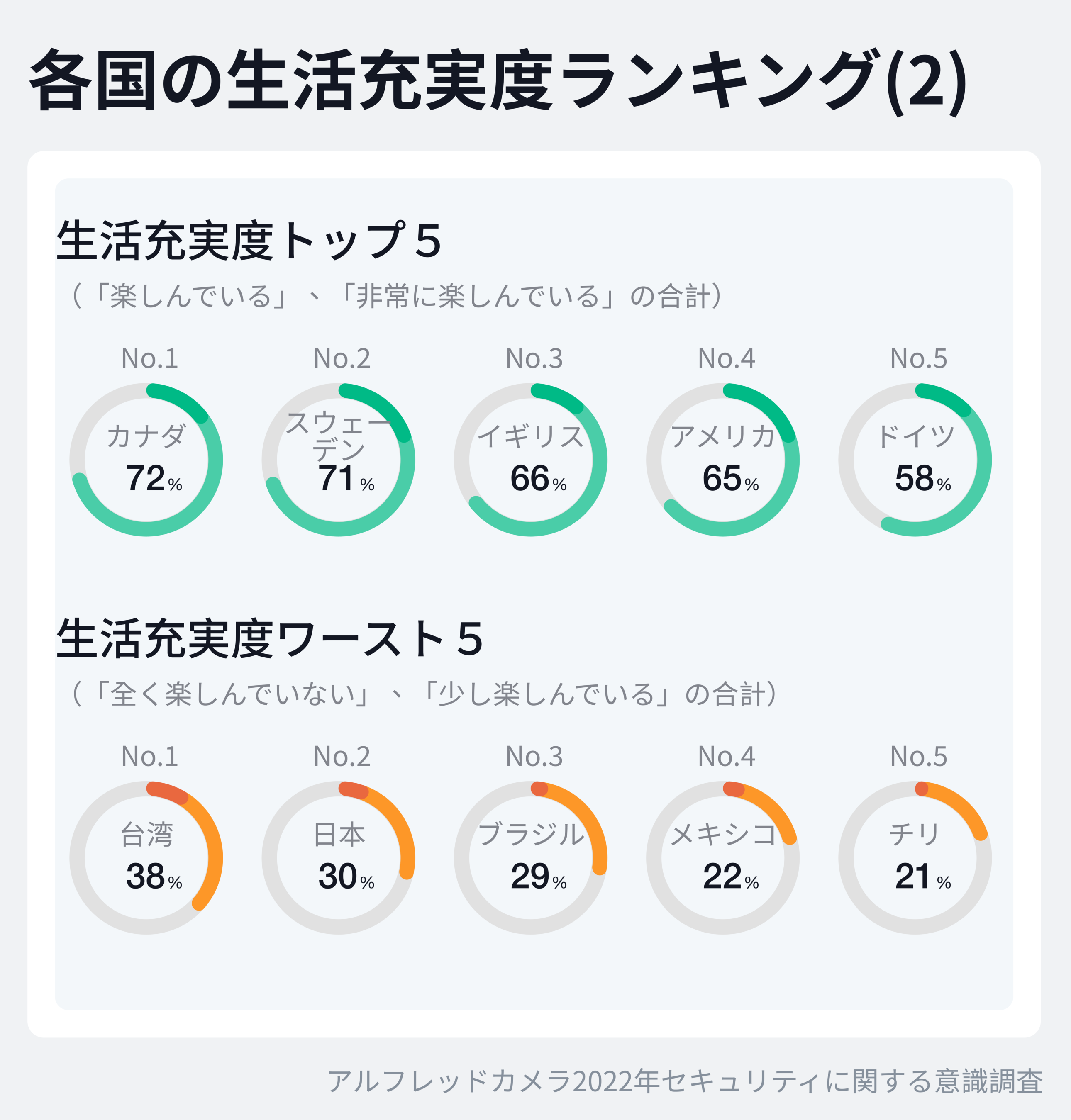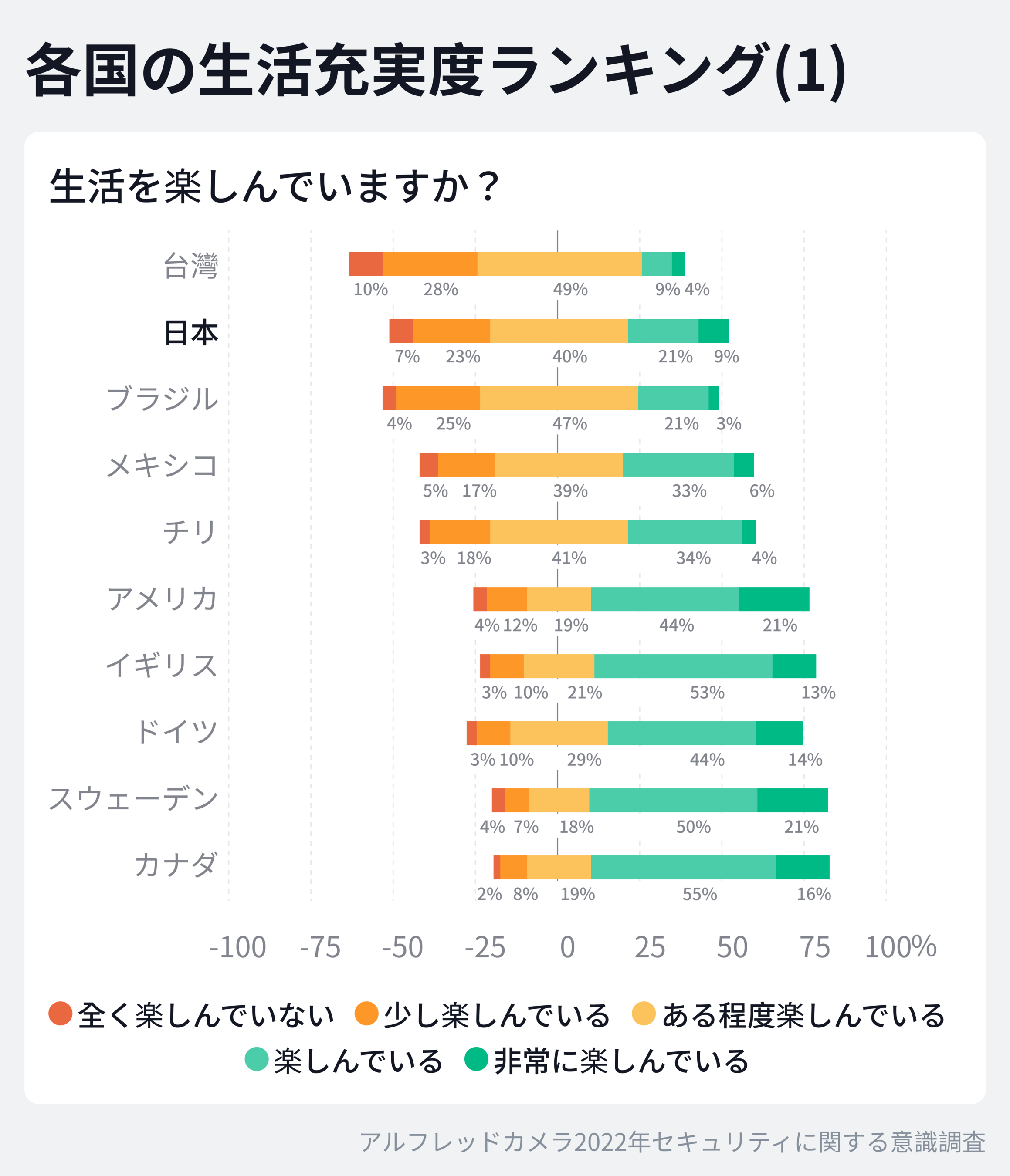 一方、アジアでは「楽しんでいる」あるいは「非常に楽しんでいる」と回答が30パーセント以下となり、逆に「全く楽しんでいない」との回答は台湾人が10パーセントで最多となり、日本人も7パーセントで2位となりました。東アジアは世界的に生活水準が高いにも関わらずこのような結果になったということに関しては国民性や文化の違い、あるいは地政学的な影響などが背景としてあるものと思われます。