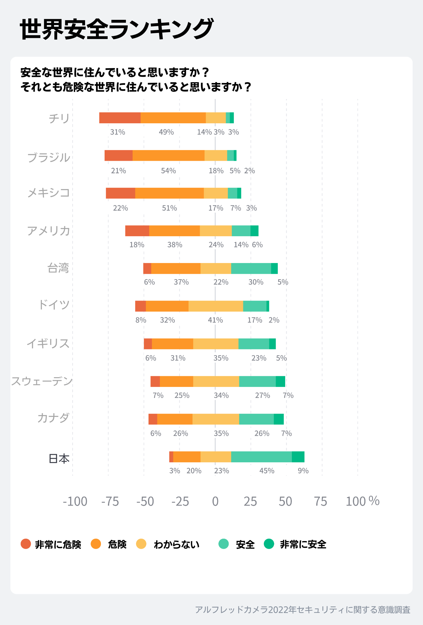 また、「日常生活はどの程度安全ですか」との問いには日本人の56パーセントが「安全だと感じる」と回答。同じ先進国でも「安全だと感じる」との回答が37パーセントの米国や36パーセントのドイツを大きく上回りました。