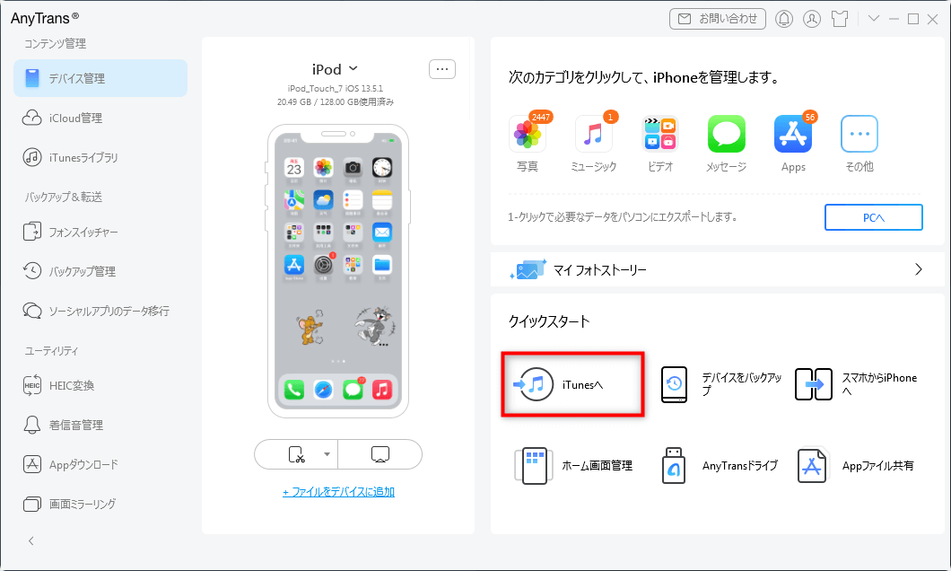 以上がiPodからiTunesに曲をコピーする方法です。AnyTransは音楽だけでなく、写真、動画、着信音、連絡先などのデータをパソコンとiPod/iPhone/iPadの間で、更にiOSデバイスの間でデータを直接転送できます。