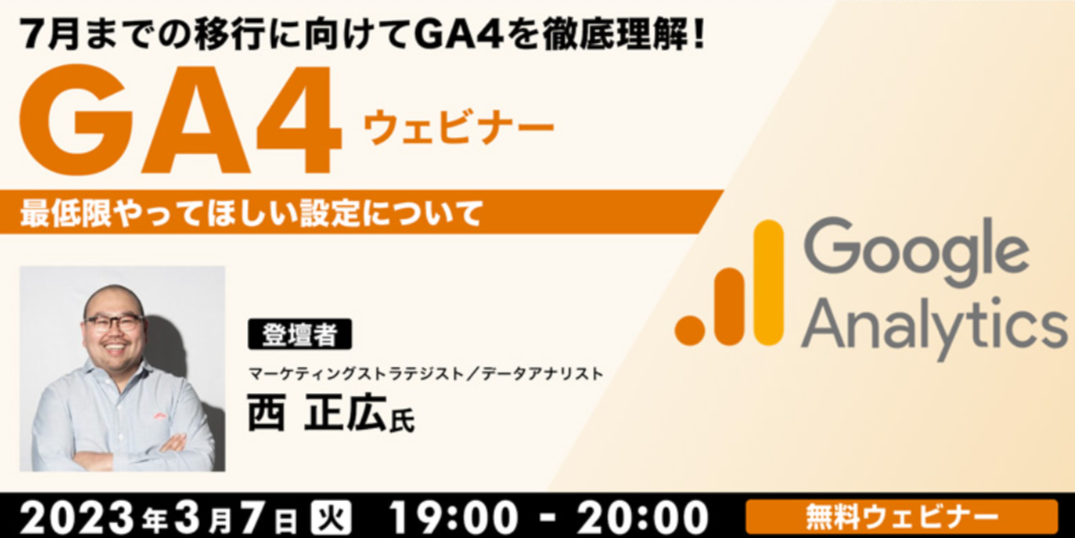 今回のウェビナーでは、実際に各企業のGA4への移行を支援するアナリストである株式会社KASCADEの西正広さんにご登壇いただき、GA4の導入が完了された企業の方やマーケティング担当の方向けに、「7月までに最低限やってほしい設定」について解説していただきます。すでに運用を開始している中でさらにGA4について学びたいとお考えの方や、分析方法について確認をしておきたい方、今まさにGA4の導入を進めている方など、ご興味をお持ちの方はどなたでもお気軽にご参加ください。