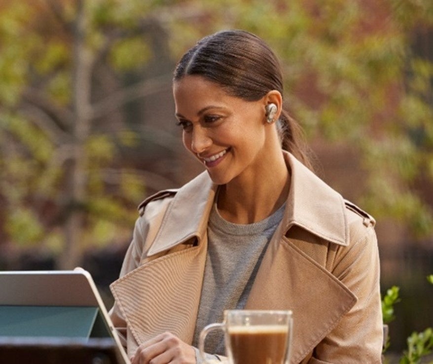 イヤホン本体には、あらゆる環境でクリアな通話を提供するように設計された片側3つずつ合計6つのマイクを搭載しています。また、外音取り込み機能の「アンビエントアウェア」、「トークスルー」機能を装備。外の音を自由に取り込めるため、イヤホンを装着したままでも会話ができ、周囲の状況を簡単に把握できます。そして、「ボイスアウェア」機能を使用すると、イヤホンに戻されるマイク入力の音を制御して、自分の声と周囲の音の量を選択できるようになります。電話中や会議中に自分の声も聞くことができるため、必要以上に大きな声で話すことなく、イヤホンから聞こえる声だけに集中することができます。