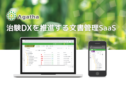 治験・臨床研究の文書をプロジェクト単位で共有し、管理・保存するためのクラウドサービス「Agatha」を、医療機関、製薬企業、医療機器企業、CRO(医薬品開発受託機関)、SMO(治験施設支援機関)、臨床検査会社などに提供することにより、治験・臨床研究の効率化・省力化に貢献することをミッションに掲げてスタートした会社です。