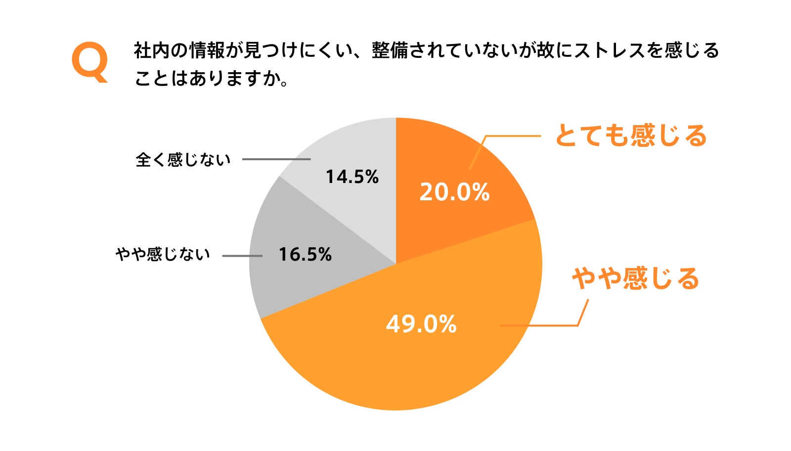 2.社内情報を調べた結果、社員の約77%が自己解決できていない。 3.自己解決出来なかった際、問い合わせる先として、70%が「上司や同僚」、59.8%が「関連部署」を選択。 4.リモートワークを行う社員の中で、約54%が「リモートワークで以前より社内情報を見つけづらくなった」と回答。 5.社内の情報を見つけづらい、整備されていないことでストレスを感じた社員は約69%。 |