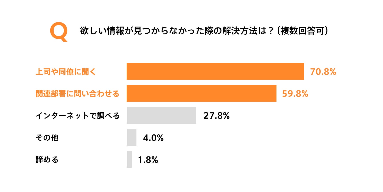 「Q.欲しい情報が見つからなかった際の解決方法は?(複数回答可)」(n=400)と質問したところ、以下の結果となりました。70.8%が「上司や同僚」、59.8%が「関連部署」に問い合わせると回答しているため、他の社員にも業務負荷がかかり、会社全体の生産性を下げてしまう可能性が見て取れます。