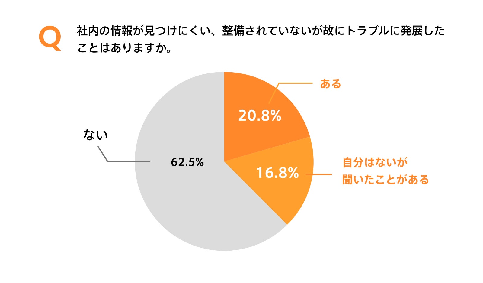 また、リモートワークが増える中、社内情報の整理、検索がより困難に感じる社員は多く、社内情報をすぐに手に入れられない状況は、社員の不満を蓄積させ、トラブルに繋がるリスクを高めます。