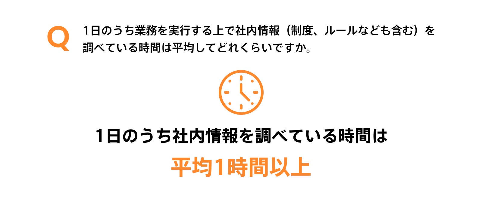 社員が社内情報の検索にかける時間は平均約1時間以上、また調べても自己解決出来ない割合も約77%と高い数値となりました。自己解決できなかった結果、上司・同僚・関連部署に問い合わせる社員が大半のため、他の社員の時間も奪ってしまい、会社全体の生産性を下げてしまっている可能性が見て取れます。