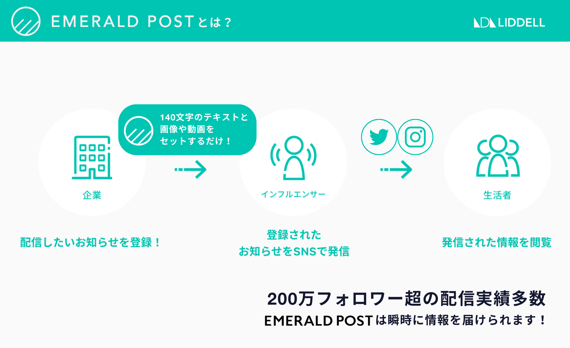 『EMERALD POST(エメラルド ポスト)』は、お知らせしたい情報を、瞬時に人から人へ発信できるビジネスモデル特許を取得した唯一のサービスです。SNS用のテキスト(140文字)と画像で、インフルエンサーがSNS上で繋がっている、友人・知人・フォロワーに向けて、情報を直接届けます。