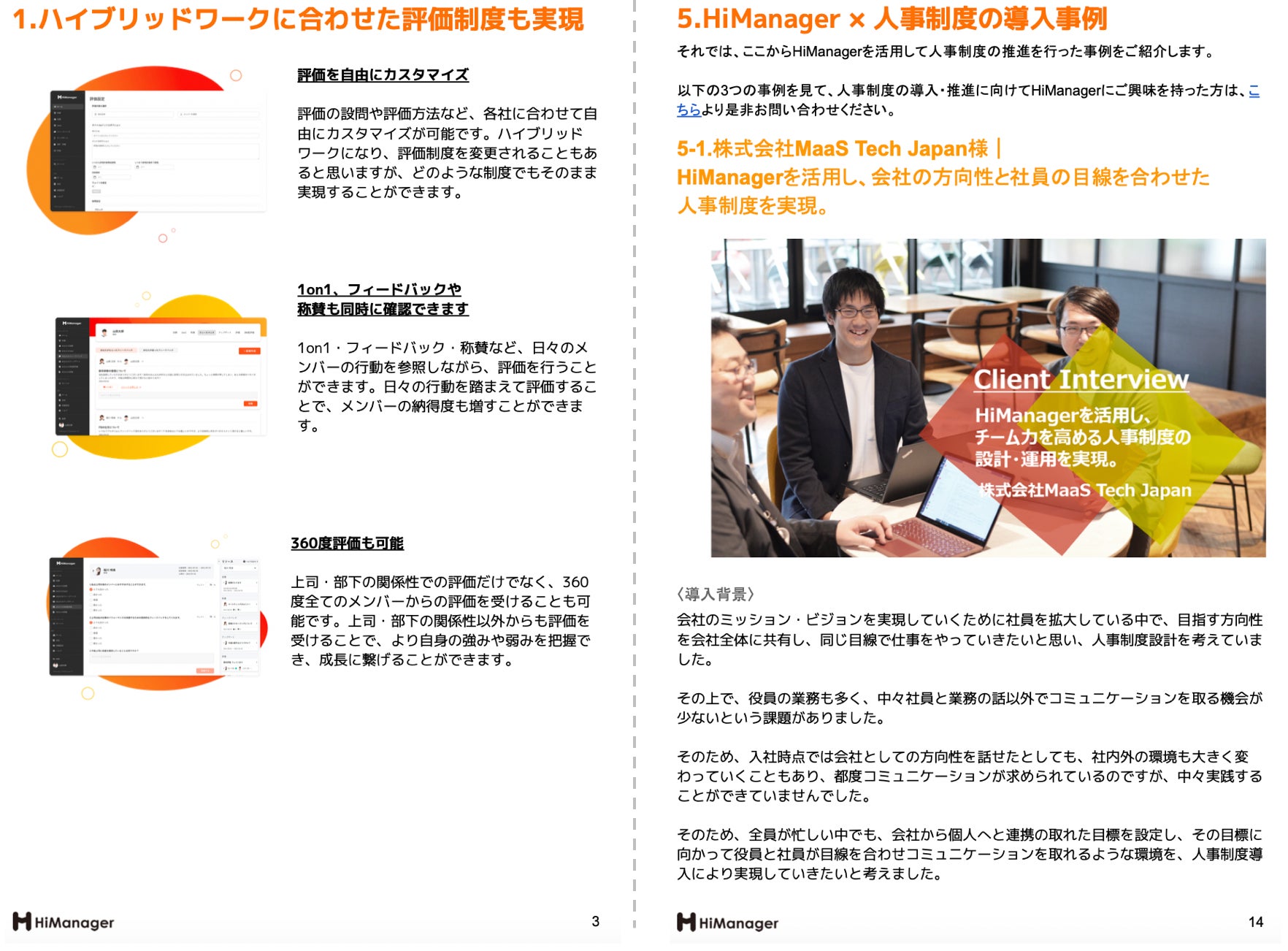 導入背景・選定理由・導入効果などともに、HiManager×人事評価制度の事例をまとめた資料です。
