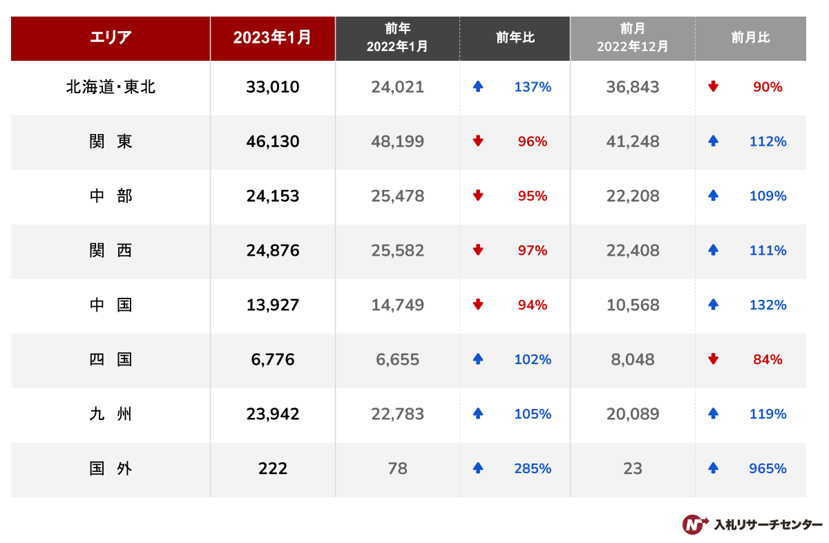 2023年1月のエリア別公示案件数は、エリアにより前年より増加・減少の傾向が分かれました。