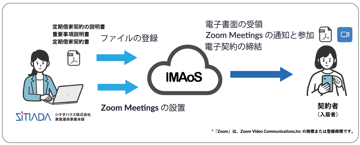 2022年5月に定期借家契約のオンラインでの手続きを可能とする規制緩和が行われました。弊社は2020年8月に法務省および経済産業省より認定を受けて行った定期借家契約での電子契約の活用に関する実証実験*なども踏まえて、定期借家契約の締結時に必要な電子交付機能やZoomミーティングとの連携機能をIMAoSに追加しております。