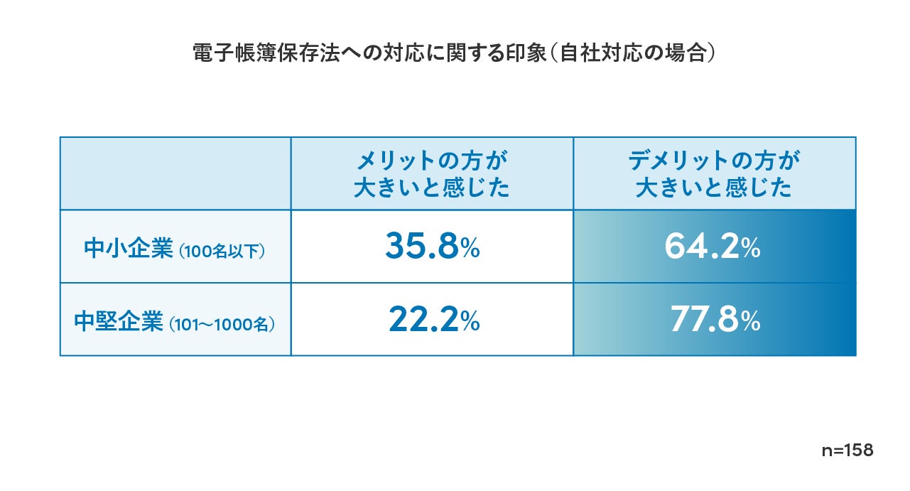- 電子帳簿保存法に対応したサービスを導入せず自社のみで対応した場合、よりデメリットを感じる傾向が判明し、特に中堅企業では約8割と謙虚な結果に