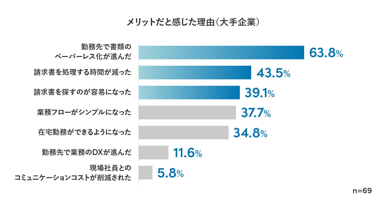 また、メリットの方が大きいと答えた大手企業に、具体的な理由を聞いてみると、第一位は「勤務先で書類のペーパーレス化が進んだ」、第二位は「請求書を処理する時間が減った」、第三位は「請求書を探すのが容易になった」でした。電子帳簿保存法への対応はペーパーレス化や業務効率化の推進につながっていることが分かりました。