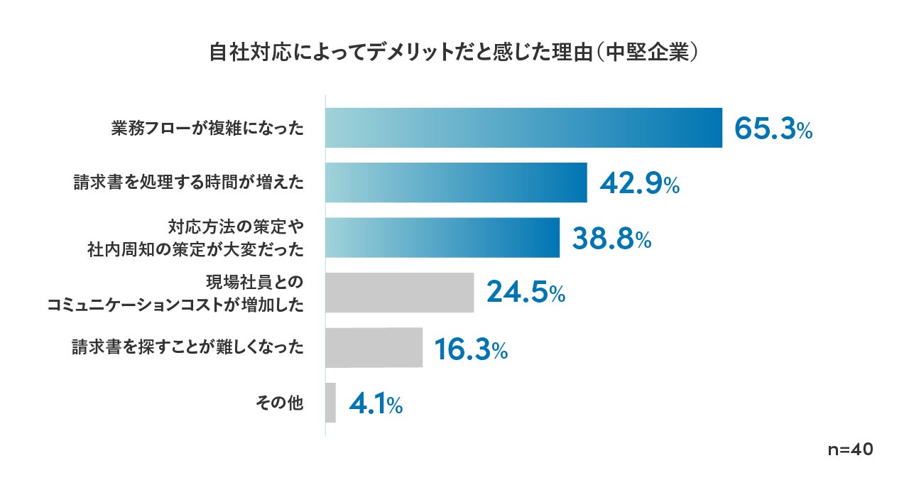 デメリットを感じている理由の第一位は「業務フローが複雑になった」、第二位は「請求書を処理する時間が増えた」、第三位は「対応方法の策定や社内周知の策定が大変だった」でした。自社で対応する場合、業務フローを再構築する必要があり、それに伴うさまざまな課題が生じていることが分かりました。