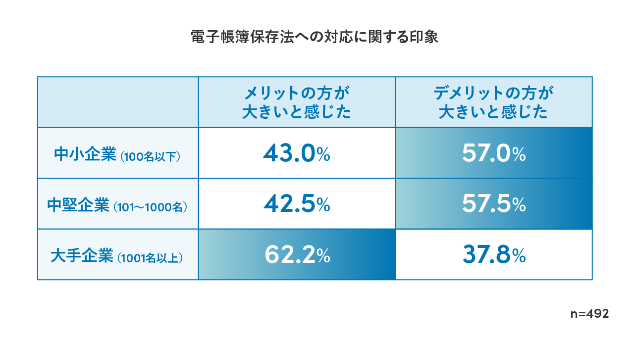 - 電子帳簿保存法に対応した大手企業の6割以上はペーパーレス化の推進や業務効率化のメリットを感じているが、中小・中堅企業ではデメリットを感じている人の方がやや上回った