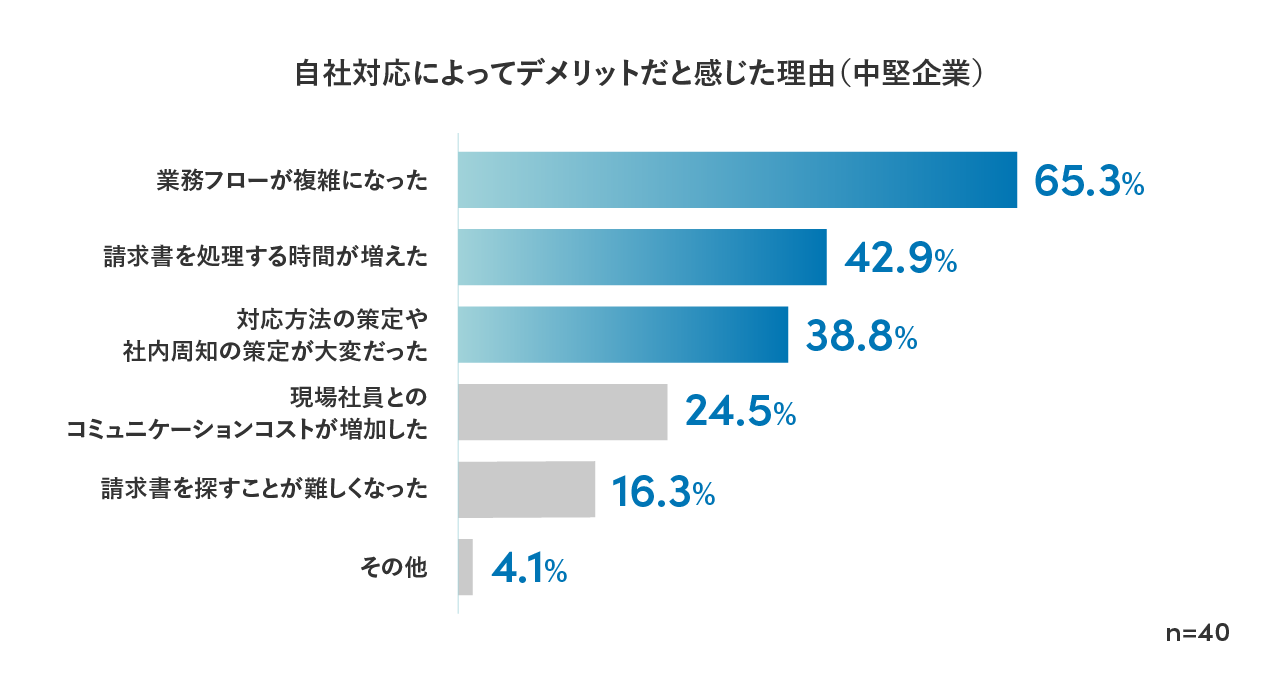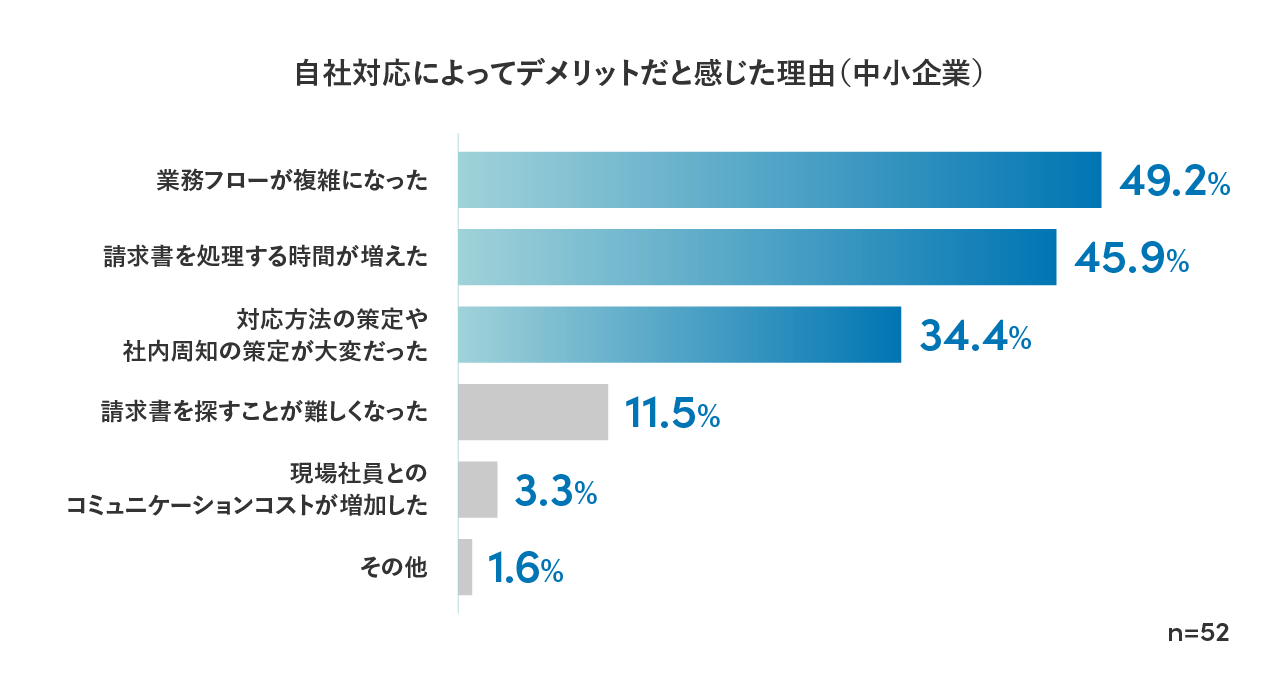 デメリットを感じている理由の第一位は「業務フローが複雑になった」、第二位は「請求書を処理する時間が増えた」、第三位は「対応方法の策定や社内周知の策定が大変だった」でした。自社で対応する場合、業務フローを再構築する必要があり、それに伴うさまざまな課題が生じていることが分かりました。