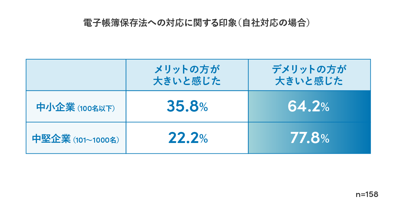 続いて、中小・中堅企業の中から、電子帳簿保存法に対応したサービスを導入せずに自社のみで対応した人に、メリットとデメリットのどちらが大きいかを聞きました。その結果、中小企業においては64.2%、中堅企業においては77.8%がデメリットの方が大きいと感じていることが分かりました。前述の通り、中小・中堅企業は対応方法によらずデメリットの方が大きいと感じている人が過半数に上りましたが、自社で対応した場合には、よりデメリットを感じていることがうかがえる結果となりました。