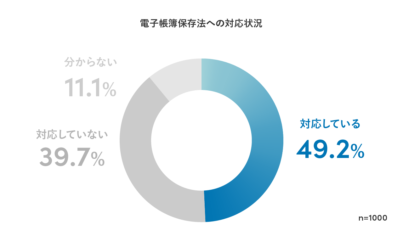 請求書関連業務に携わる1000名のビジネスパーソンのうち、電子帳簿保存法に「対応している」と答えたのは49.2%で「対応していない」が39.7%、「分からない」が11.1%でした。