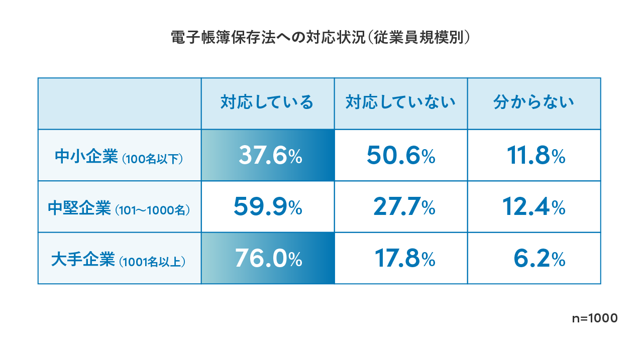 今回の調査で、2022年1月に施行された電子帳簿保存法への対応は、大企業ほど進んでおり、従業員規模によって対応状況に大きな差があることが分かりました。