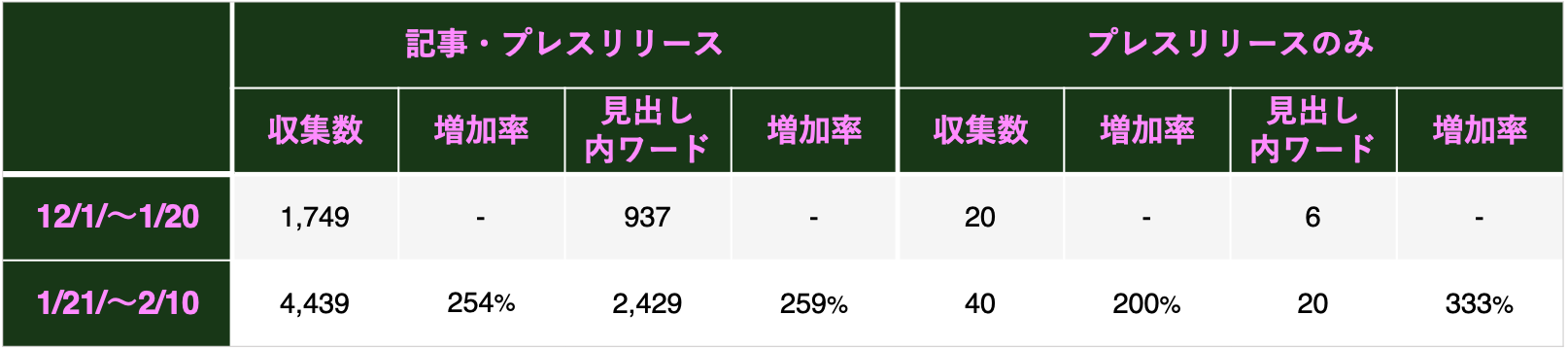・1月下旬以降、記事数は2.5倍、プレスリリースは2倍に