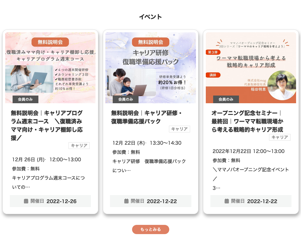 これらの「イベント」「記事」「コミュニティ」機能を活用して、ワーママとしての視野を広げることができます。