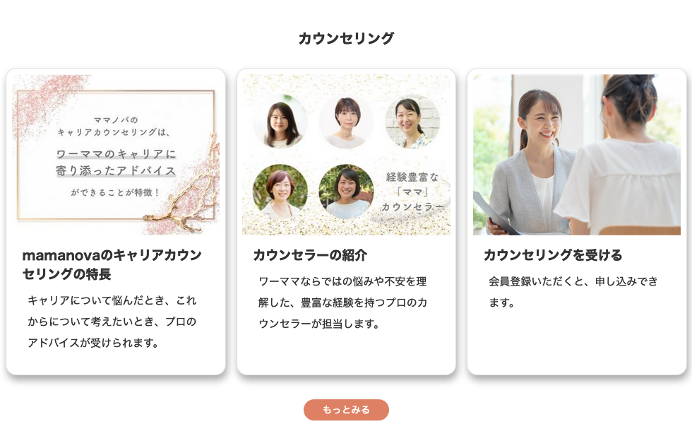キャリアカウンセリング、「理想の働き⽅を知るワークショップ」や「キャリアに活きるマインドセット」など、自身のつよみや市場価値を知って自信を持つための研修、転職サービスなど、それぞれを個別に提供するサービスはほかにもありますが、 「mamanova」は、ワンストップですべてをカバーしています。