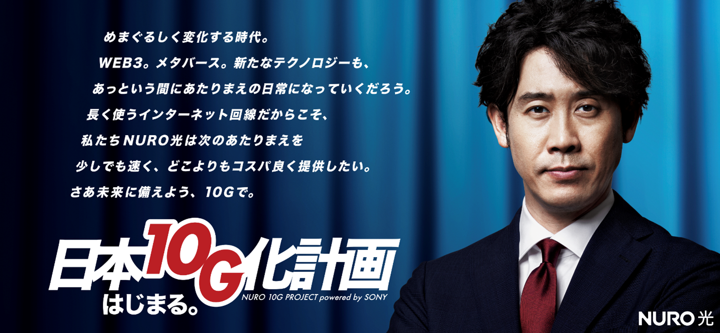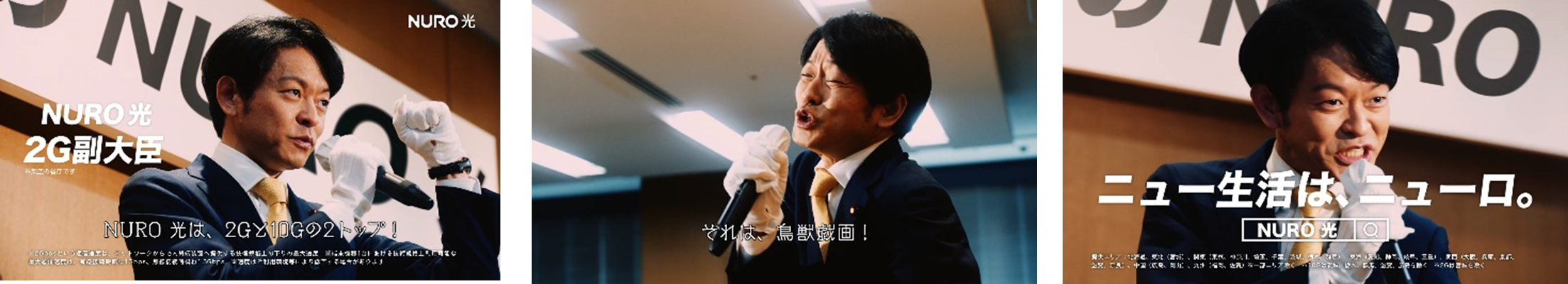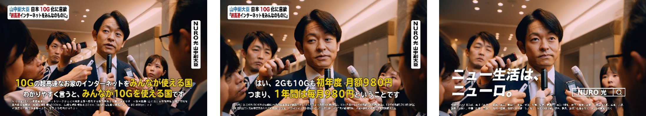 1月19日より公開しているTV-CMは、大泉洋さんが自身初の大臣役となる「NURO 光 10G大臣」に扮し、10ギガの「NURO 光」を日本中に普及させる「日本10G化計画」を宣言する内容となっています。国会議事堂内の議場をリアルに再現した会場で、「日本10G化計画」を大々的に発表したり、反論する議員と論争を繰り広げるなど、大臣として奮闘する姿を披露しています。この大泉10G大臣と共に「日本10G化計画」を推進するのが、山中2G副大臣です。