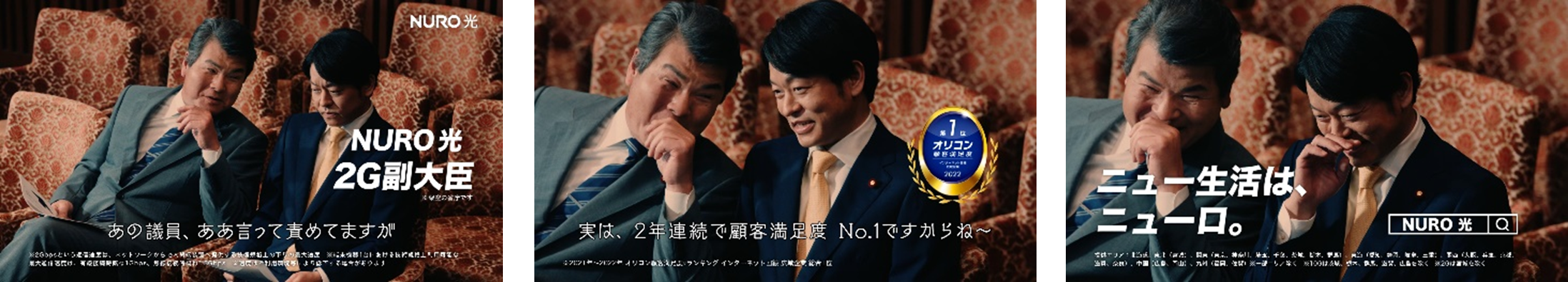 「大臣、インターネット1ギガじゃダメなんですか?」と議会が緊迫する中、山中2G副大臣の隣に座る議員から「あの議員も、実はNURO 光の10ギガを契約した。」という情報を耳打ちされます。他にも、コスパの良さには抗えず恋愛ドラマをサクサク観ているなど、次々と明らかになる新事実に、あの厳しい質問も「愛の裏返し的な?」と二人でひそひそ話をする様子をまとめた、実際の議会でもありそうな一幕をコミカルに描いています。