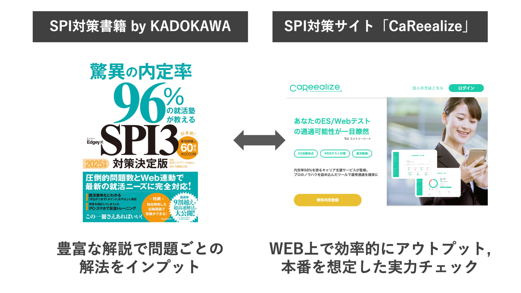 ユーザーは解説量が豊富な書籍でSPIの解法をインプット。また実際にその問題を解くことができるのか?実力チェックやアウトプットには対策サイト「CaReealize」を活用いただく。このサイクルを回すことで、SPIの学習にいままでにない爆発的な効率を生むことができます。
