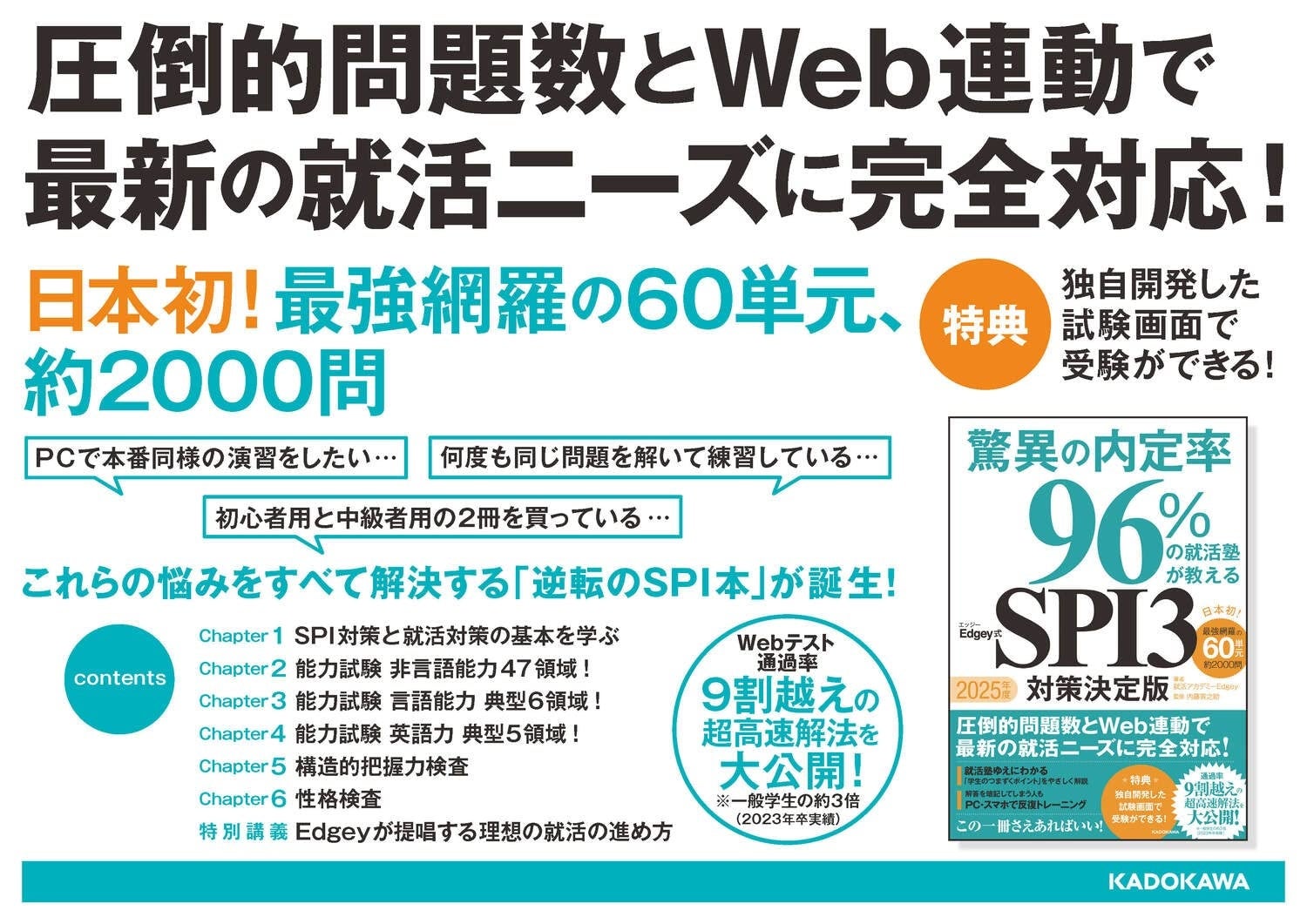 本書は、就活塾が学生の声をもとに、圧倒的問題数・就活対策用Webサービスとの連動を実現した一冊完結のSPI本です。※定価:2,200円(本体2,000円+税)