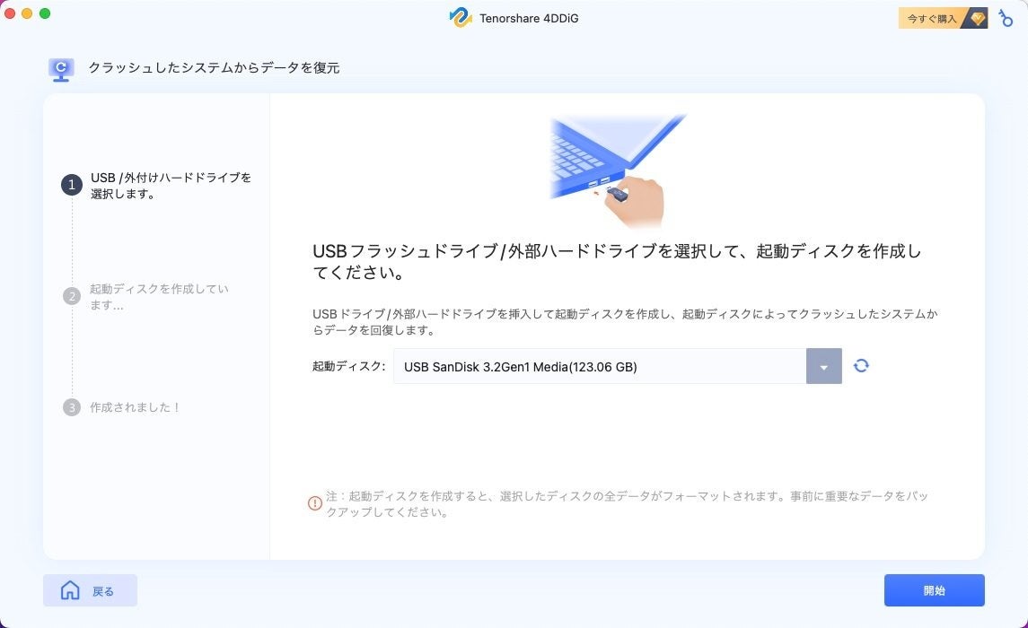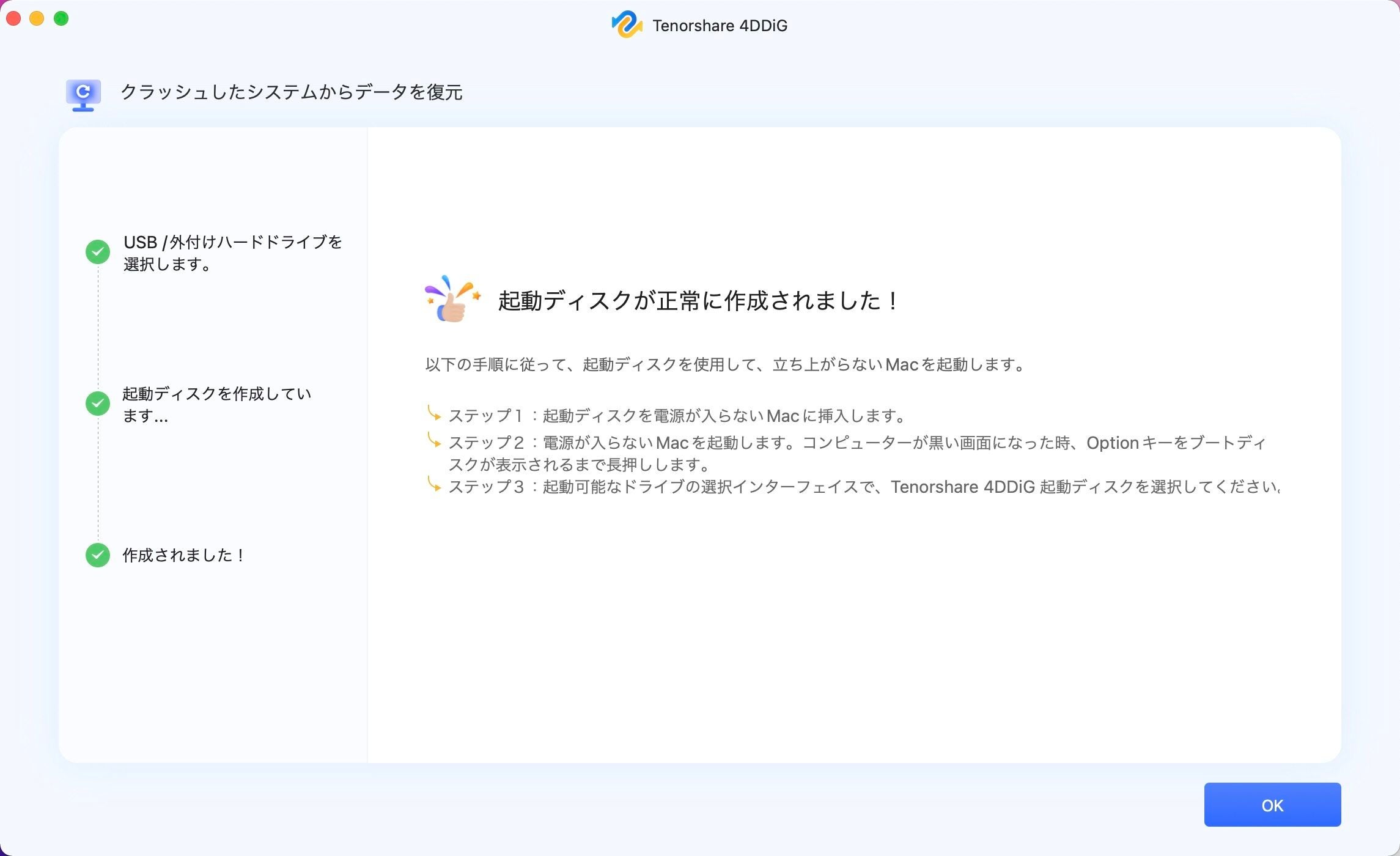 また、OSをインストールしてから、パソコンが起動できない場合は、「Tenorshare 4DDiG-Mac」でクラッシュしたMacからデータを復元できます。