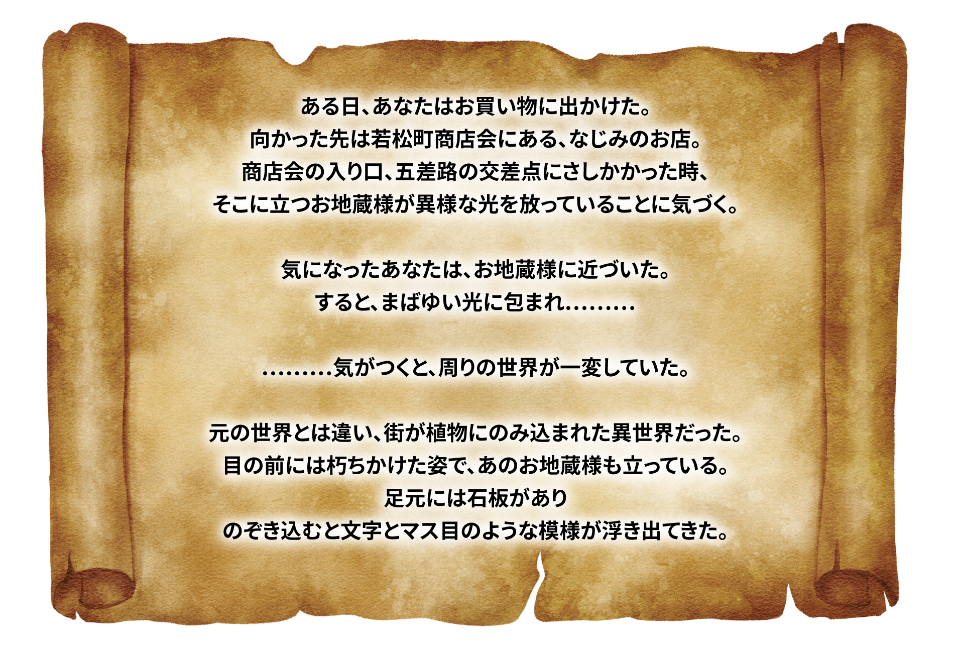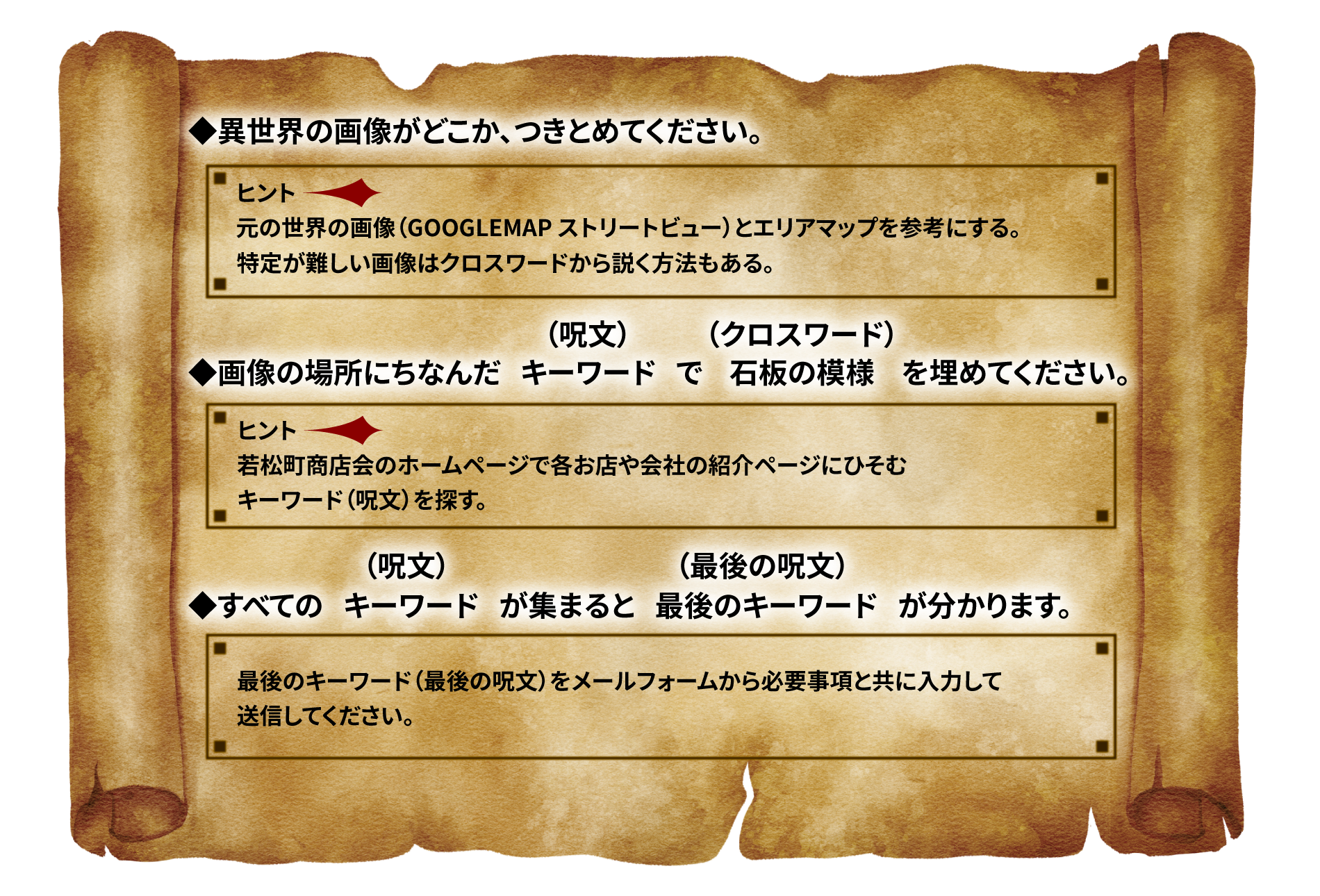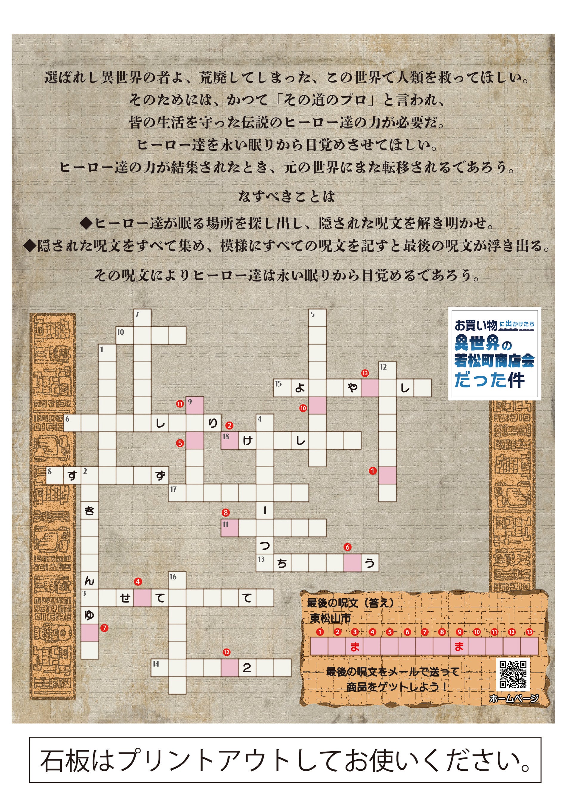若松町商店会のホームページ(https://wakamatsusa.com/)で各お店や会社の紹介ページにひそむキーワード(呪文)を探し出し、石板の模様(クロスワード)を埋めていきます。
