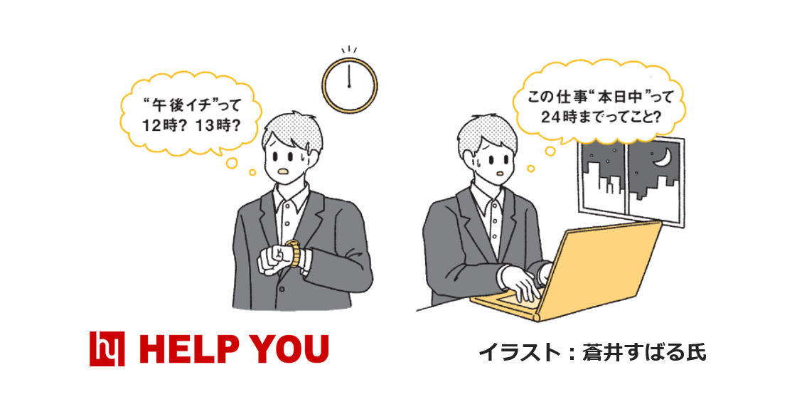 「午後イチ」「本日中」など、テキストコミュニケーションでは、人によって定義が異なり、解釈が広がるあいまいな言い方はやめましょう。