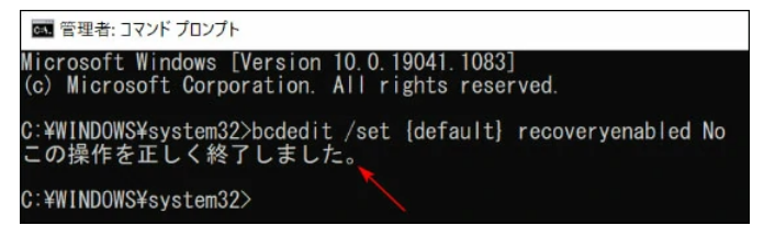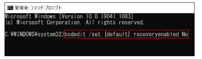 Step2:コマンド「bcdedit /set {default} recoveryenabled No」を実行します。